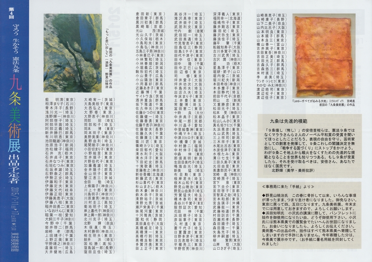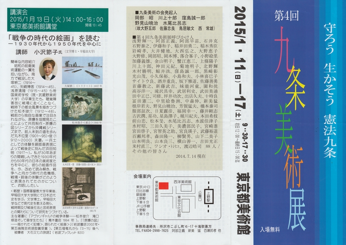 第4回九条美術展が都美術館で開催されます。今までは埼玉県近代美術館での開催でしたが、改装なった都美術館使用希望の抽選に当たり今回の開催です。危機迫る九条を守ろうという呼びかけに応えて、様々な場で活躍する美術家(画家・研究者)が結集しています。